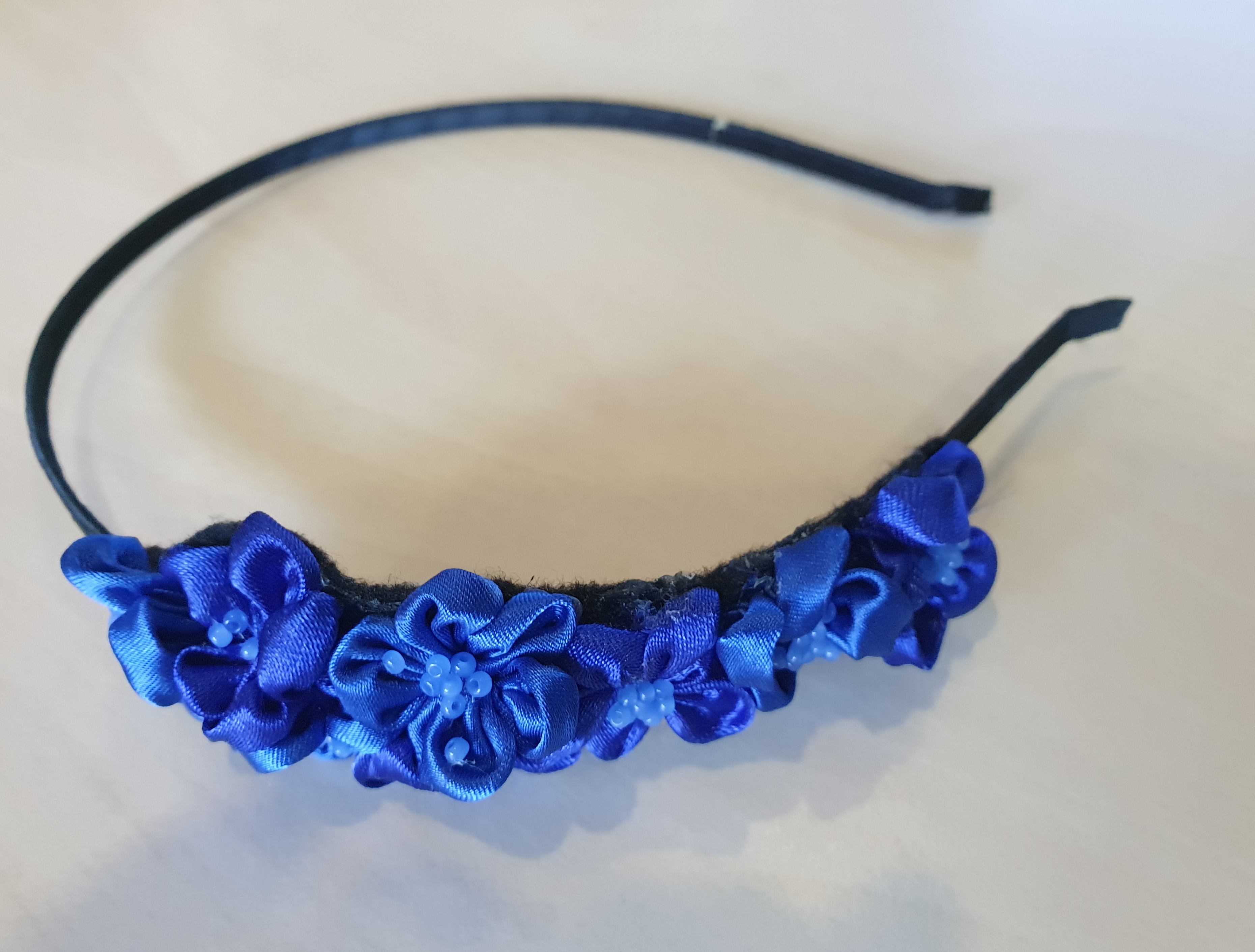 Saténová čelenka s ručně vyrobenými textilními květy je vhodná ke každodennímu nošení.