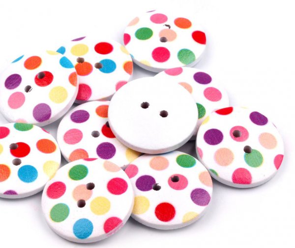 Tyto dřevěné knoflíky jsou ozdobené barevnými puntíky. Motiv je pouze jednostranný, druhá strana je bílá. Knoflíky mají dvě dírky o průvleku 2 mm. Perfektně se bude vyjímat zejména na dětském oblečení. Vhodné k použití na scrapbooking.