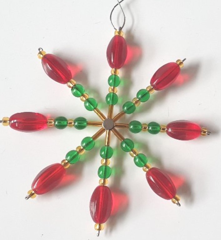 Ručně navlékaná vánoční ozdoba z korálků inspirována tradičními vzory vánočních ozdob vyráběných v první polovině minulého století.