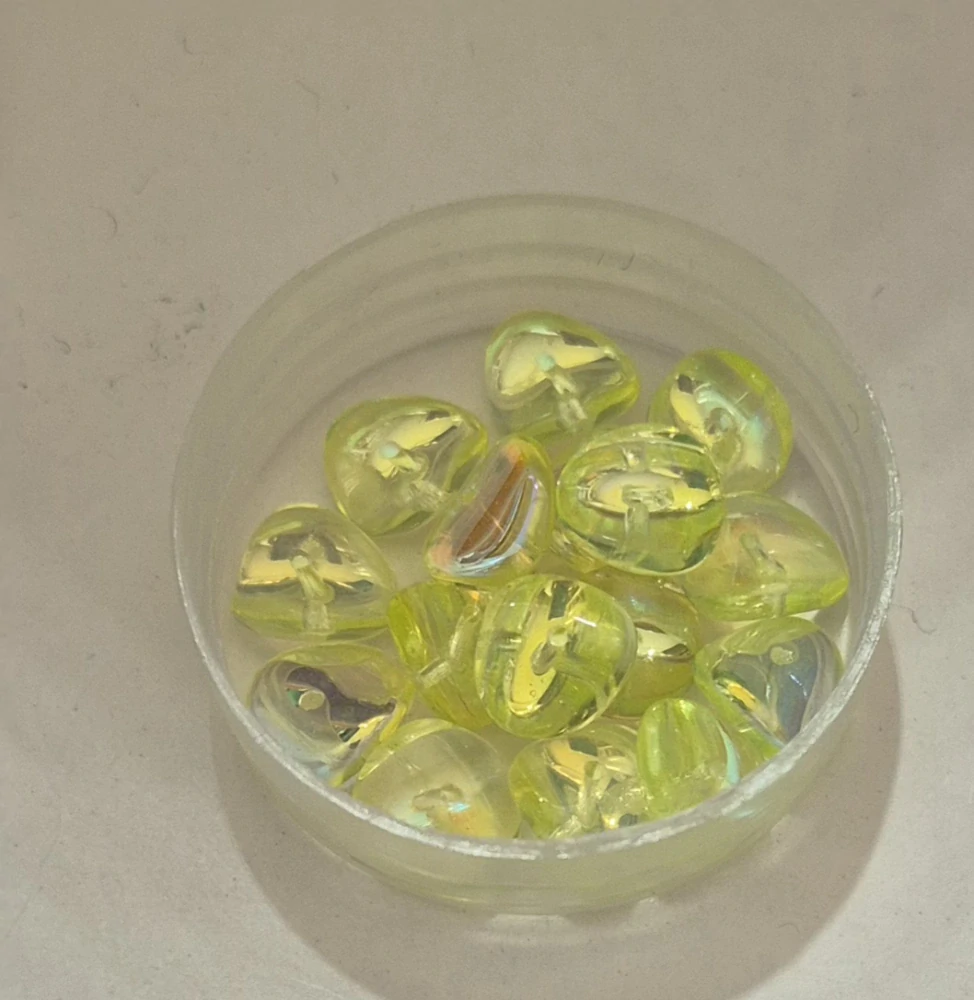 Mačkané skleněné korálky z unikátního uranového skla s pokovem AB. Obsah oxidu uranu jim propůjčuje fascinující fluorescenční efekt pod UV světlem, což z nich činí výjimečný materiál pro tvorbu šperků a dekorací. Tento unikátní materiál je známý svou fascinující fluorescencí – pod UV světlem svítí krásně zeleně.