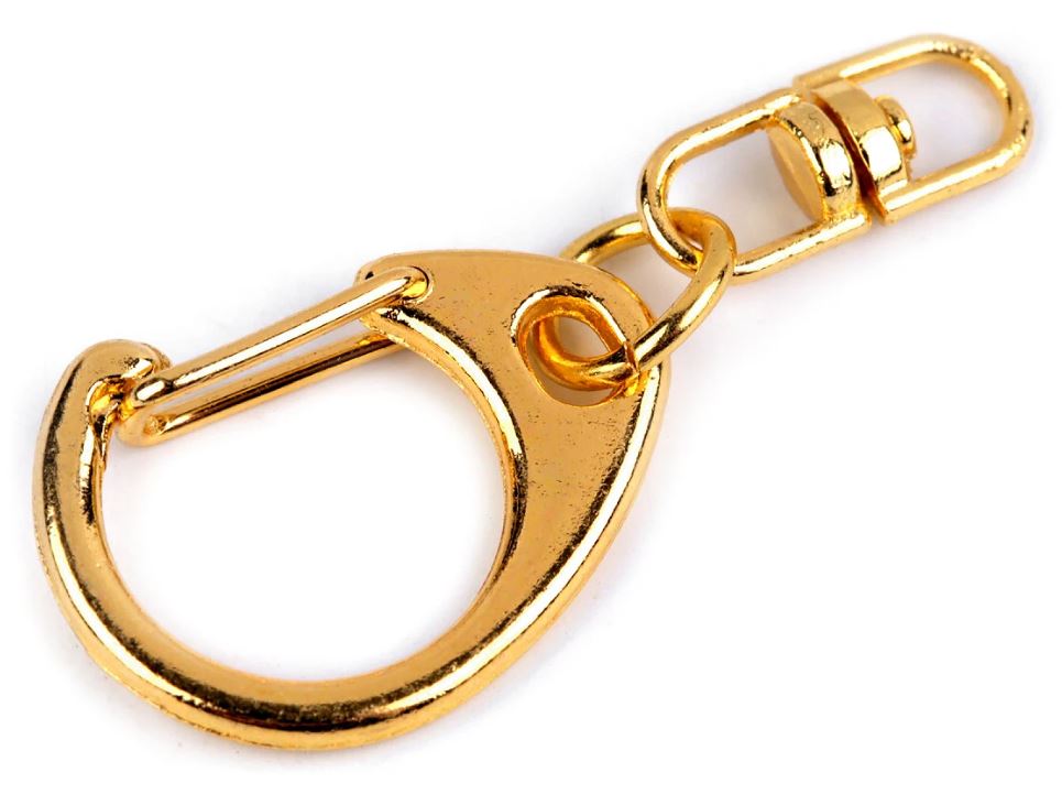 Pevná kovová karabina na otočném čepu. Šířka karabiny činí 18 mm, takže je vhodná na drobnější přívěsky a subtilnější kabelky. Délka 40 mm, šíře 18 mm.