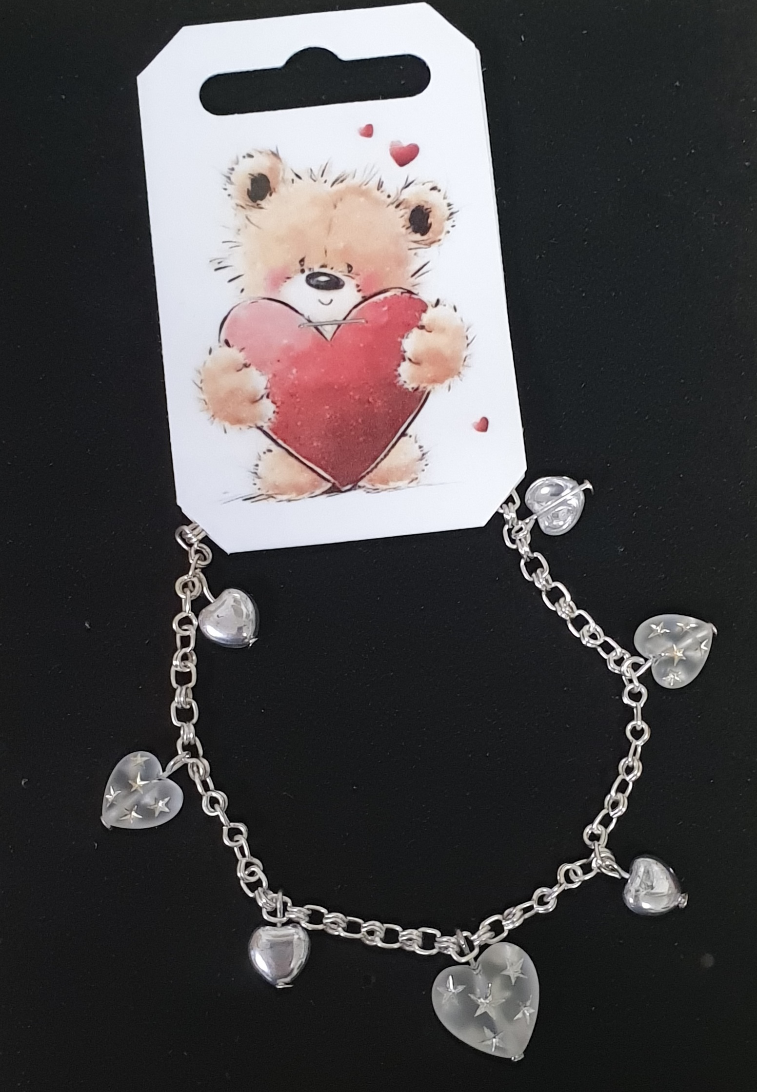 Ketlovaný náramek se skleněnými korálky ve tvaru srdíček. Celková délka náramku 24 cm, zapnout se dá v libovolné délce, zapínání karabinka. Řetízek v barvě platiny - běžný bižuterní kov.