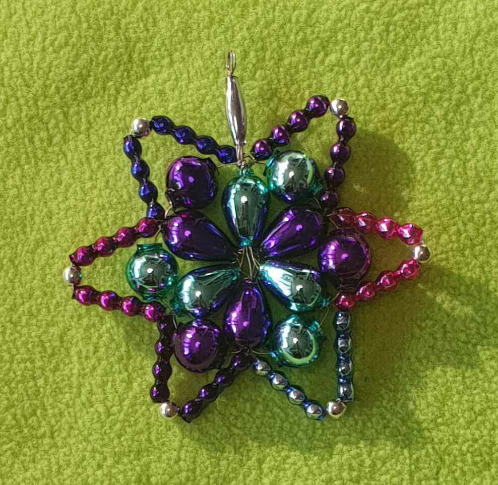 Ručně navlékaná vánoční ozdoba z korálků inspirována tradičními vzory vánočních ozdob vyráběných v první polovině minulého století.
