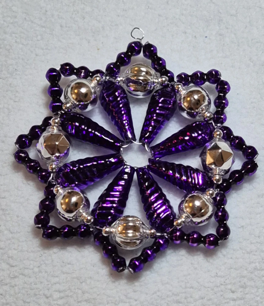 Ručně navlékaná vánoční ozdoba z korálků inspirována tradičními vzory vánočních ozdob vyráběných v první polovině minulého století.